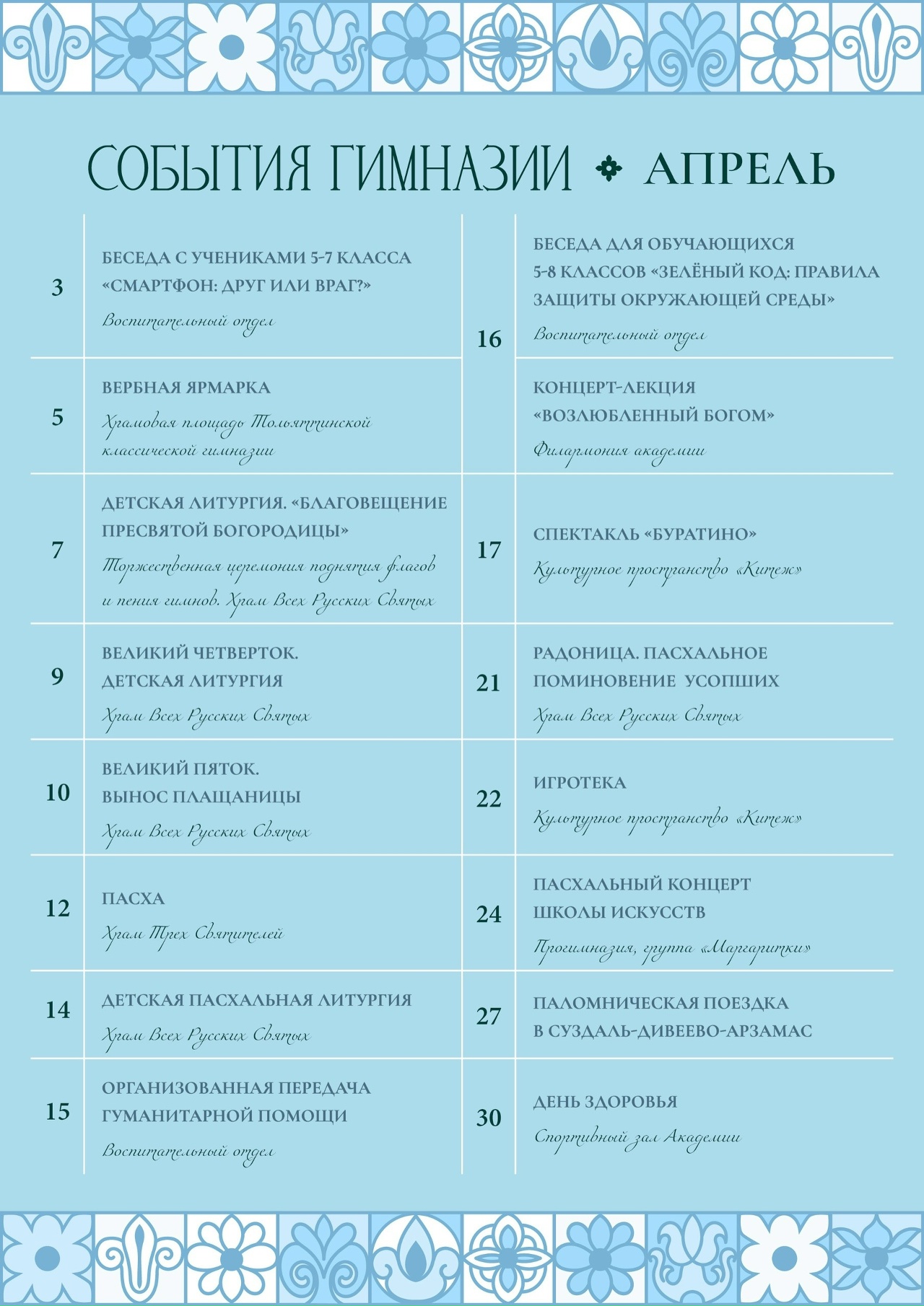 Новости Подготовили афишу мероприятий на апрель. от 31.03.2026 Ещё Новости: 5 апреля в 11:30 приглашаем на ярмарку. 01.04.2026 В гимназии состоялся педагогический совет. 31.03.2026 VIII Региональная молодежная научно-практическая конференция «Поволжский фестиваль студенческой науки». 28.03.2026 Поделиться:Нажмите, чтобы распечатать (Opens in new window)Отправить ссылку в Елицы (Opens in new window)Отправить ссылку в Одноклассники (Opens in new window)Отправить ссылку в ВКонтакте (Opens in new window)Click to share on Telegram (Opens in new window)