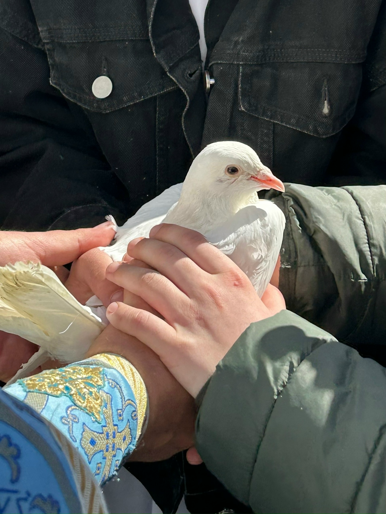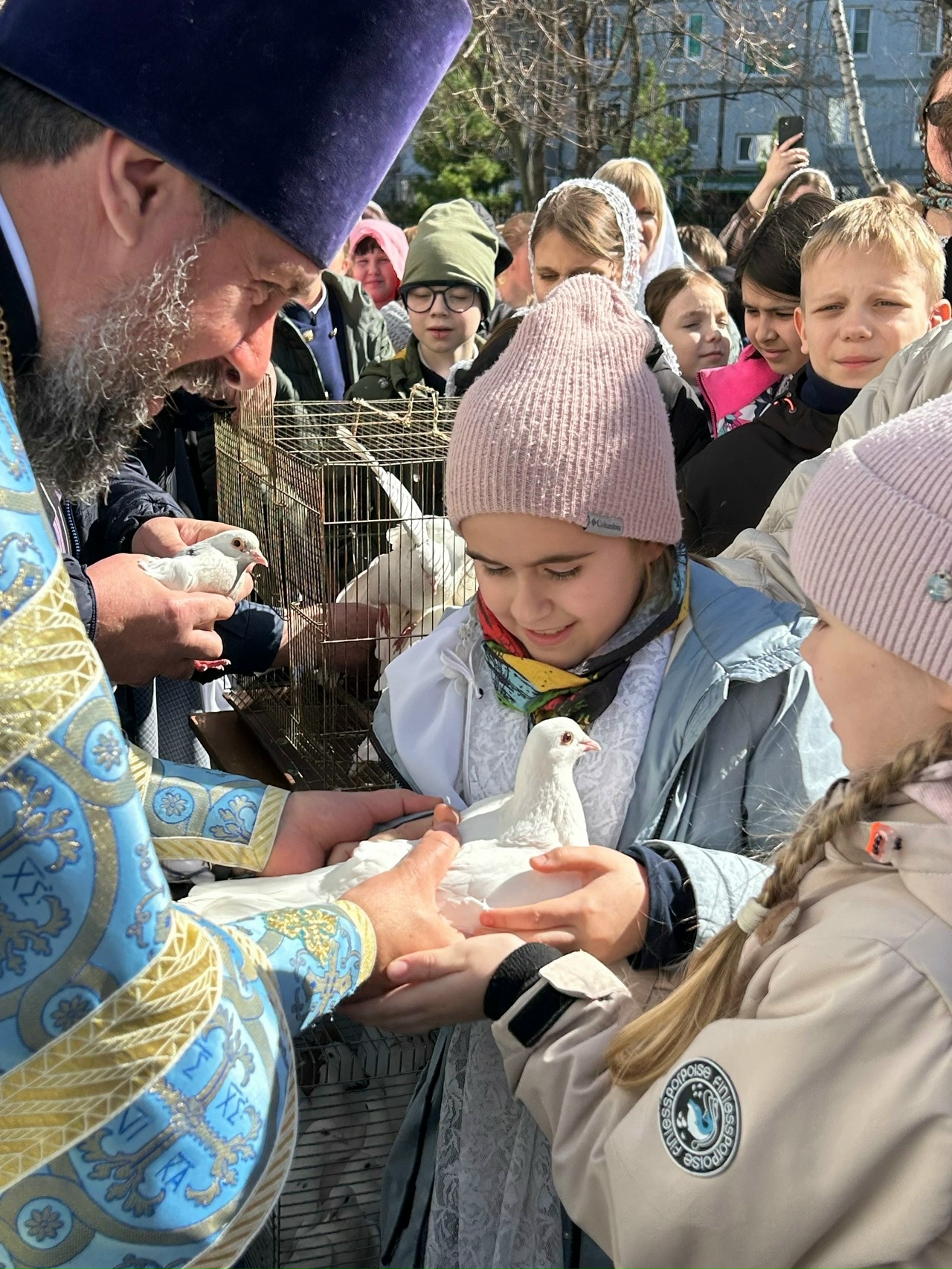 Состоялась детская литургия с особым чином, где многие гимназисты причастились. А после службы по многолетней доброй традиции мы все дружно прочитали стихотворение А. С. Пушкина «Птичка» и выпустили в небо белоснежных голубей.